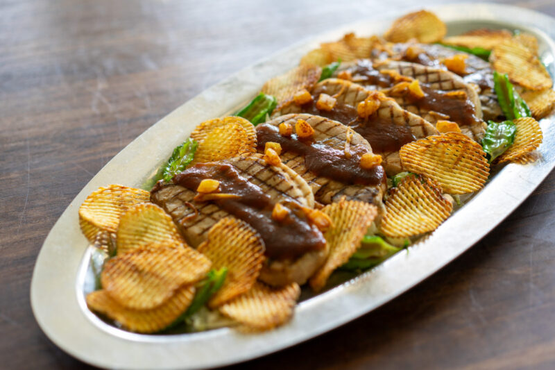 EM乳酸菌発酵の力で旨みをアップした県産豚ロースをじっくりグリル。ジューシーな旨みを、甘酸っぱいパイナップルと生姜の香りが引き立てます。