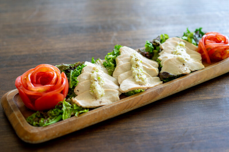 塩麹でマリネした鶏むね肉を低温でしっとり仕上げました。シェフオリジナルのネギ塩麹レモンだれでさっぱりヘルシー。