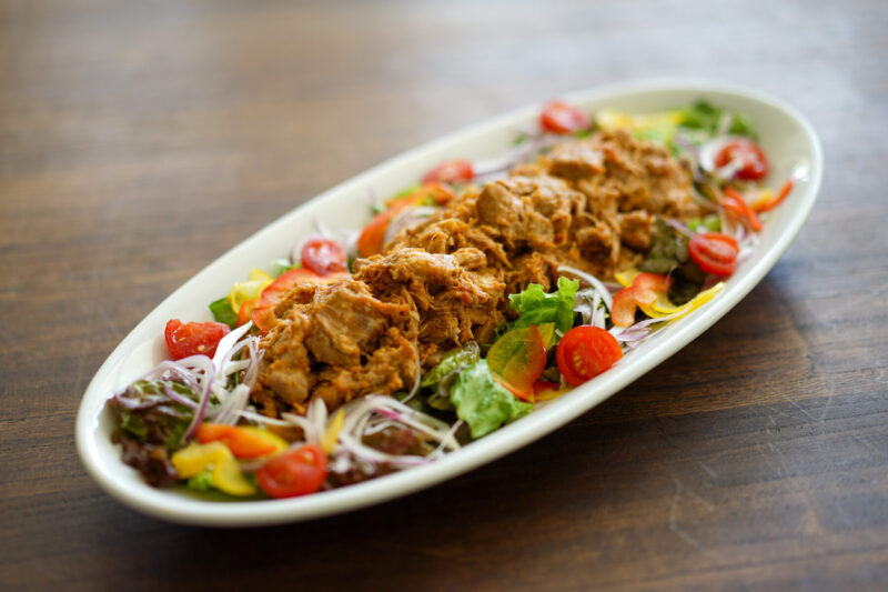 豚肩ロースを香味野菜とスパイスで煮込み、やわらかくほぐしてサラダと合わせました。スパイシーながらもさっぱりした一皿です。