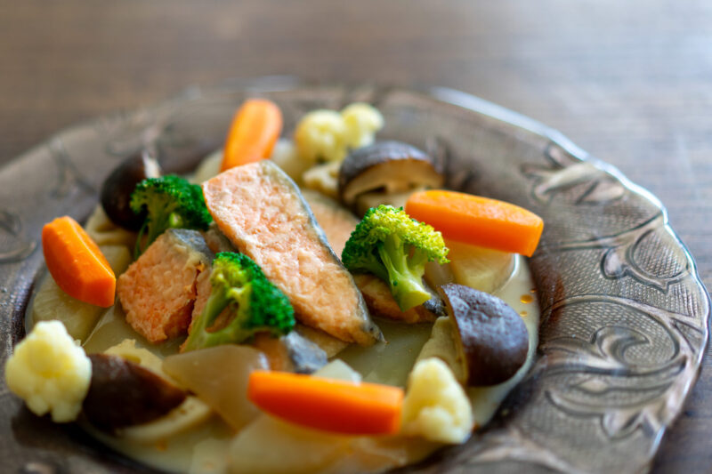 県産の酒粕を使い、発酵の旨みを生かしたやさしい味わいに。塩麹に漬け込んだ鮭は、臭みがなくふっくら柔らか。体を芯から温めてくれる冬にぴったりの一品。