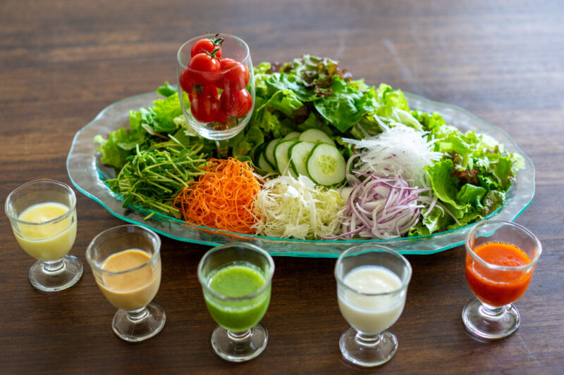 自社農場からの有機野菜と国産野菜のサラダバーに、沖縄素材を発酵させた自家製ドレッシングをたっぷりかけてお楽しみいただけます。