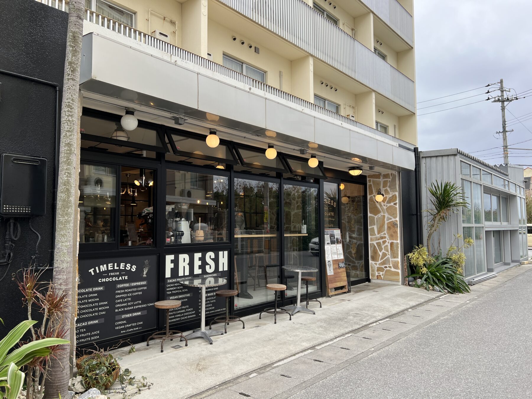 北谷散策の途中で立ち寄れるのが、クラフトチョコレート専門店 Timeless Chocolate(タイムレスチョコレート)。シンプルで洗練された外観とミニマルな店内デザインが特徴で、西海岸の小さなショップを思わせる空間です。