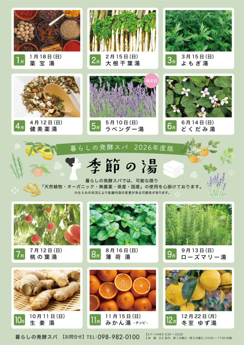 暮らしの発酵スパでは、季節ごとの自然素材を活かした「季節の湯」をお楽しみいただけます。 天然植物や無農薬・国産の素材を可能な限り使用し、心も体も癒される贅沢なひとときをお届けします。 毎月四季の移ろいを感じながら、ゆったりとお過ごしください。 2026年も皆さまのご来館を心よりお待ちしております! 【営業時間】 6:30~22:00 【お問い合わせ】 098-982-0100 【休館時間】 第一、第三月曜日/10:00-17:00