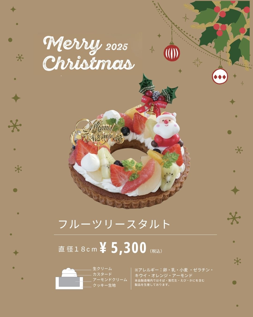 サクサクのタルト生地に、なめらかなクリームと色とりどりのフレッシュフルーツを贅沢にトッピング。まるでリースのような華やかな見た目が、特別な日を彩ります。